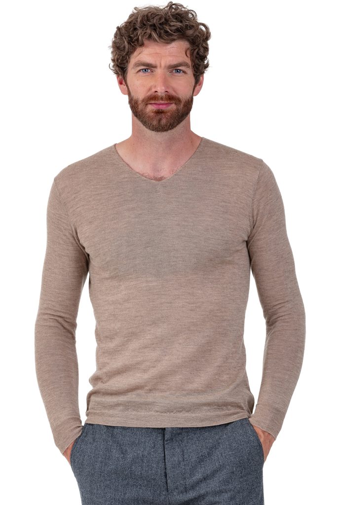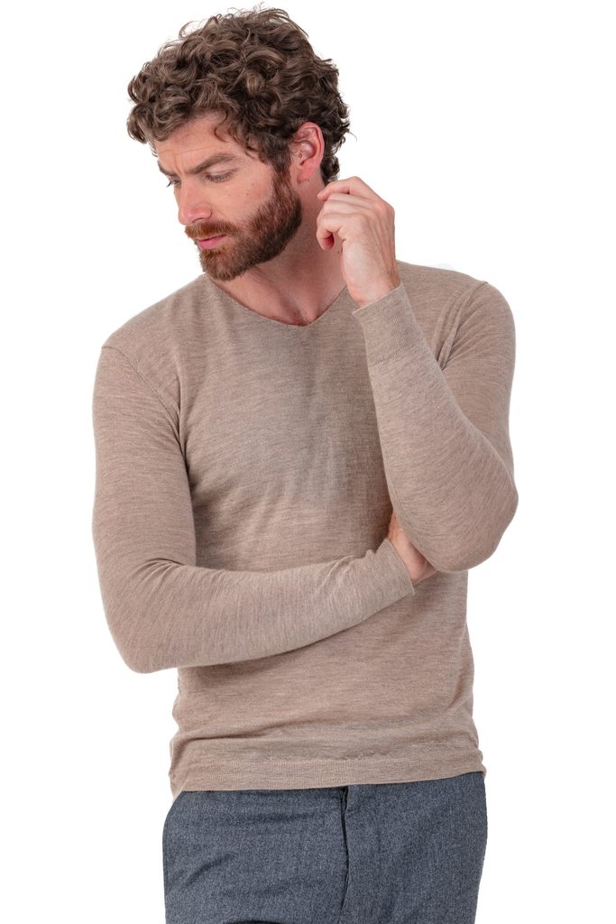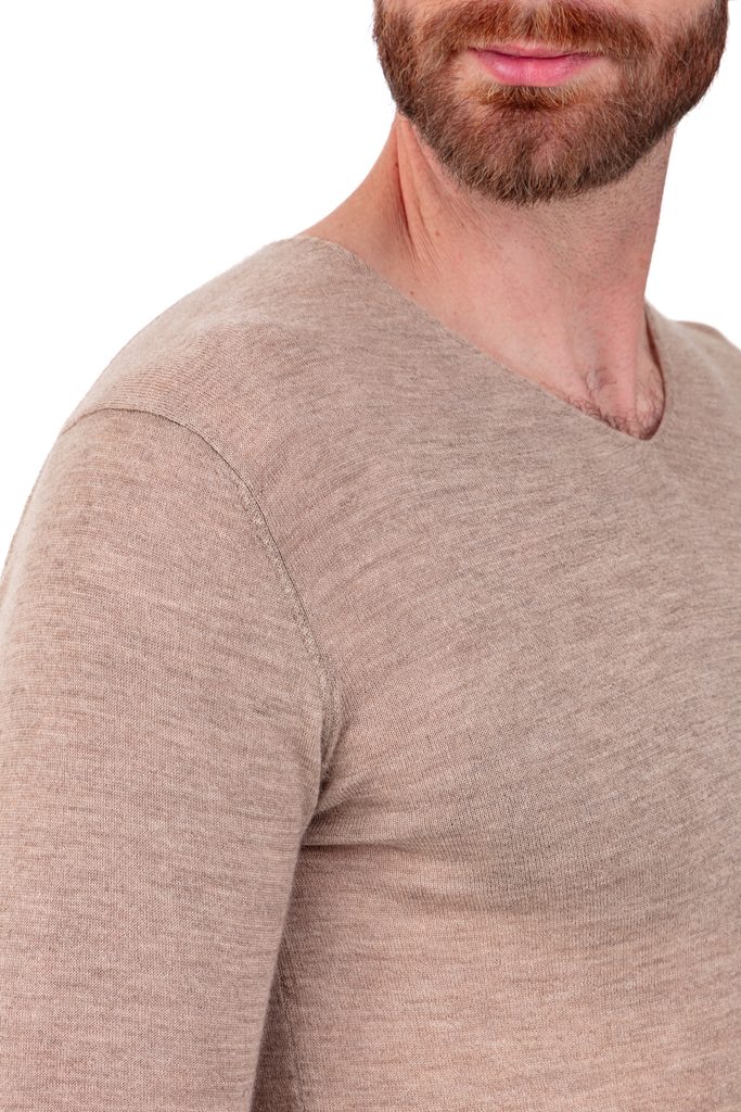 Otroligt mjuk v-ringad tröja tillverkad i ett mycket fint kashmirgarn. Om man rullar ut 1 kg av detta garn sträcker det sig 60 km. Att bäras direkt på huden milda vintrar eller svala nätter på våren och sommaren vid havet.
