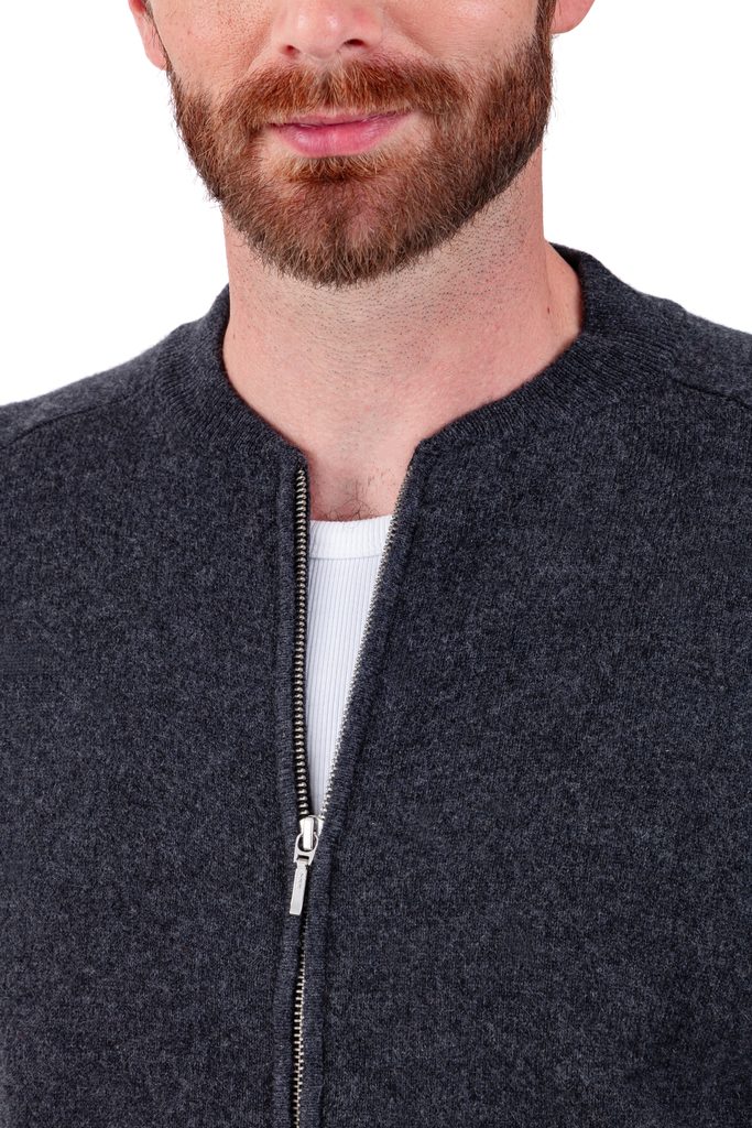Tento kašmírový kardigan na zips, ktorý kombinuje pohodlie a eleganciu, je ideálny na dotvorenie vášho outfitu. Jeho bomber golier, raglánové prieramky a Milano steh vpredu mu dodávajú športový, no zároveň elegantný štýl. Noste ho s tričkom alebo spoločenskou košeľou pre nadčasový vzhľad.
