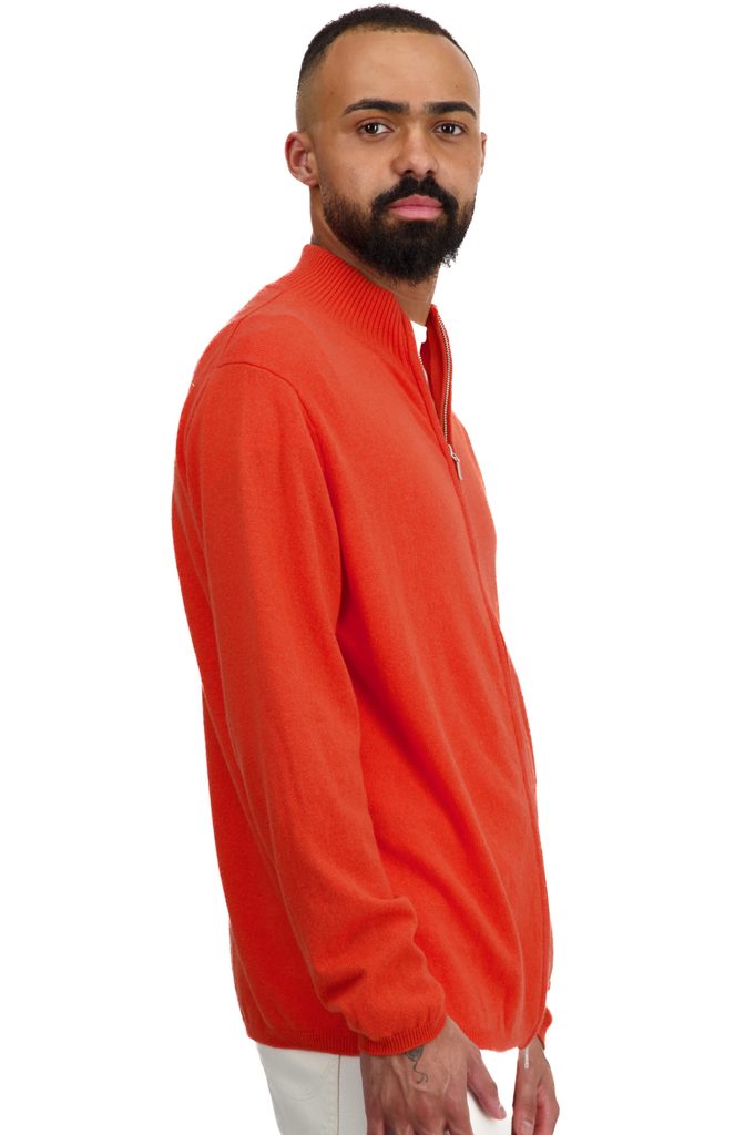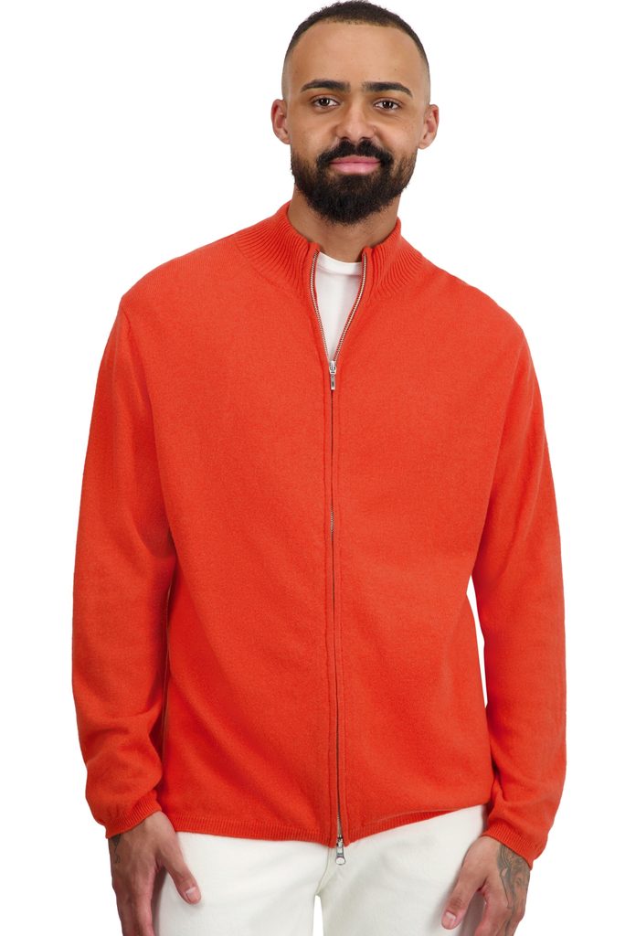 100% kashmir, 2 skikt. Elegant herrmodell i sportig stil med tvåvägsdragkedja. Fin ribbstickning i ärmslut och nederkant. Lämplig för att träffa vänner, för staden och för naturen.