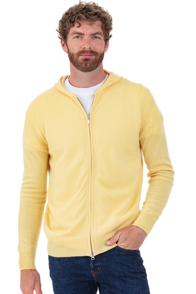 100% kashmir, 2 skikt. Mycket trendig herrmodell med huva och tvåvägsdragkedja. Lämplig för att bära hemma och vid sport. Ärmarna och bottenkanter har en 6 cm bred markant ribbning.